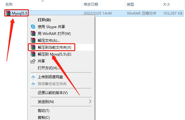 1.打开下载的MySQL 5.5软件安装包,鼠标右击压缩包选择【解压到当前文件夹】。