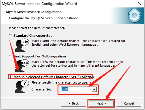 20.选择【Manual Selected Default···】,【Character Set】处选择【utf8】或者【gbk】,然后点击【Next】。