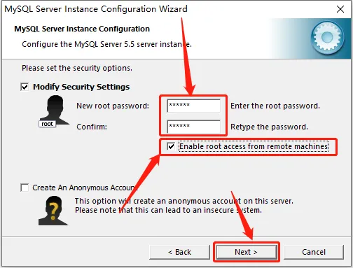 22.输入密码mysql,勾选【Enable root access···】,然后点击【Next】。
