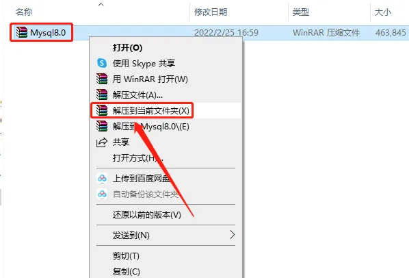 1.打开下载的MySQL 8.0软件安装包,鼠标右击压缩包选择【解压到当前文件夹】。