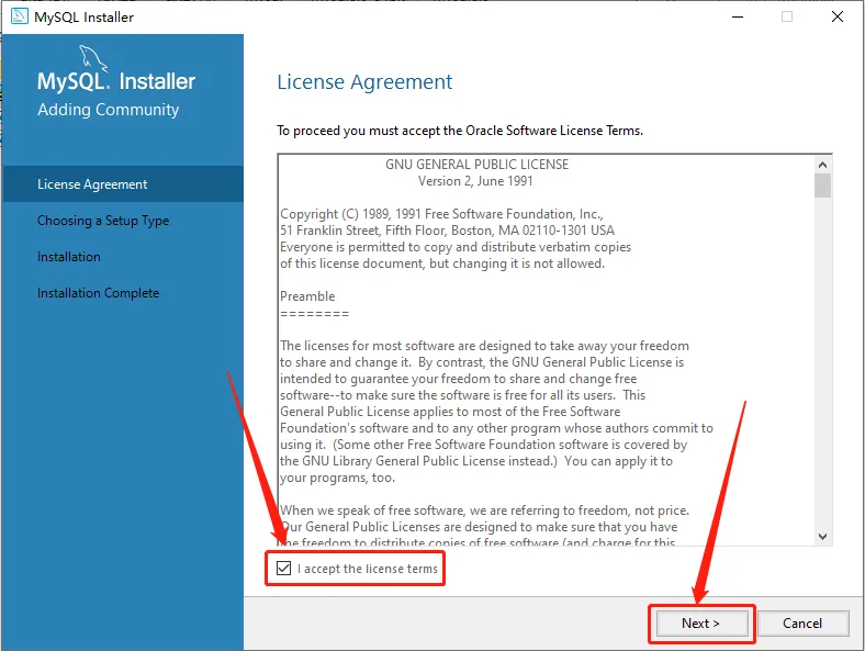 4.勾选【I accept the license terms】,然后点击【Next】。