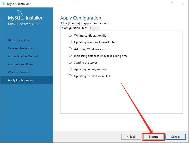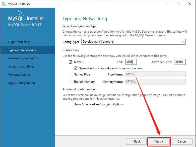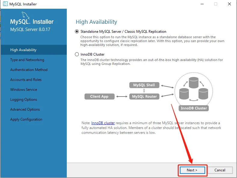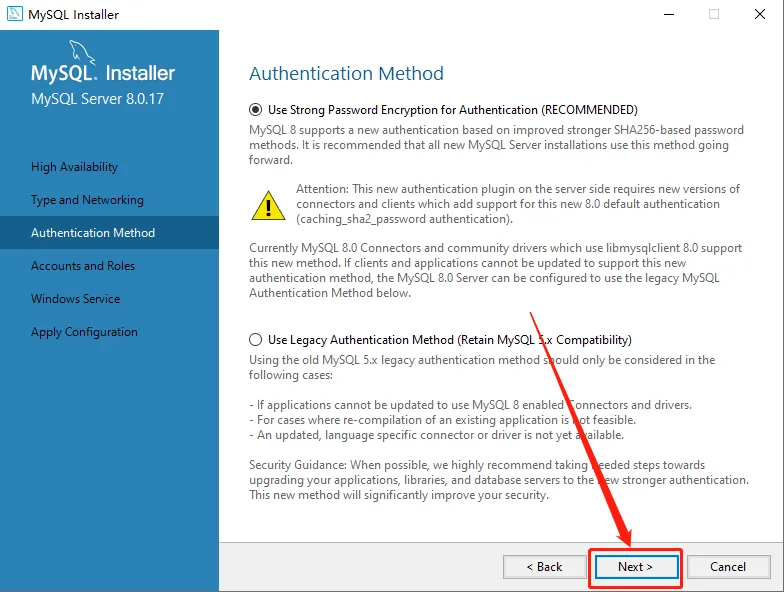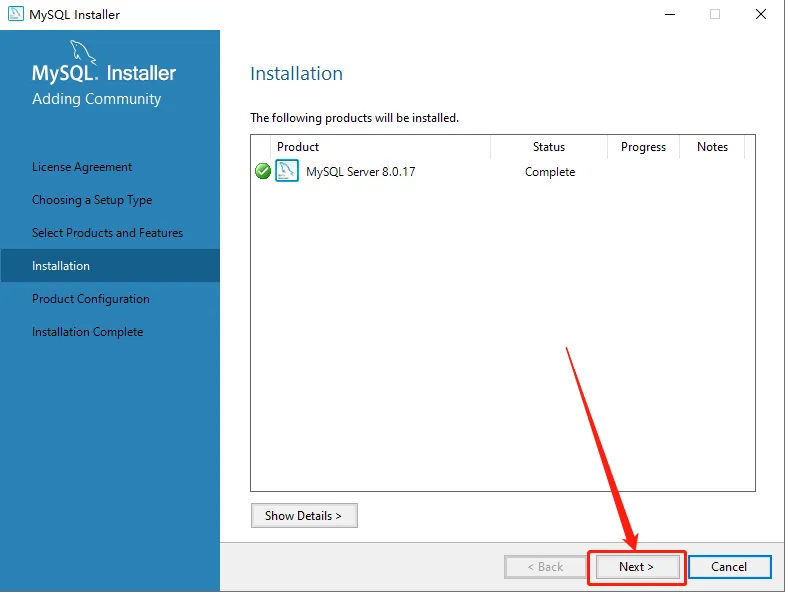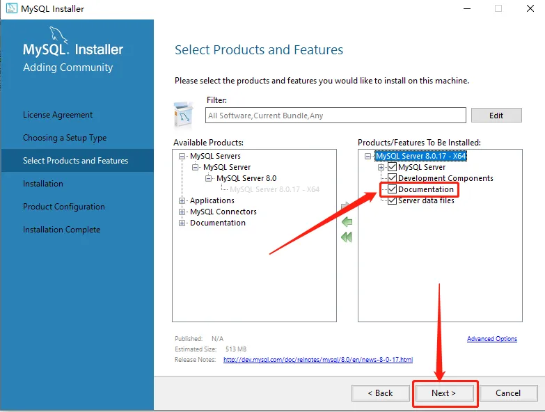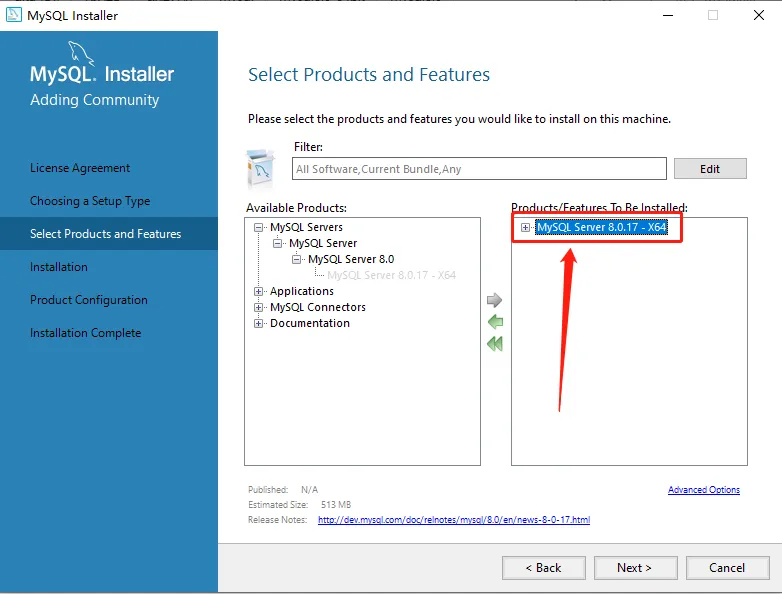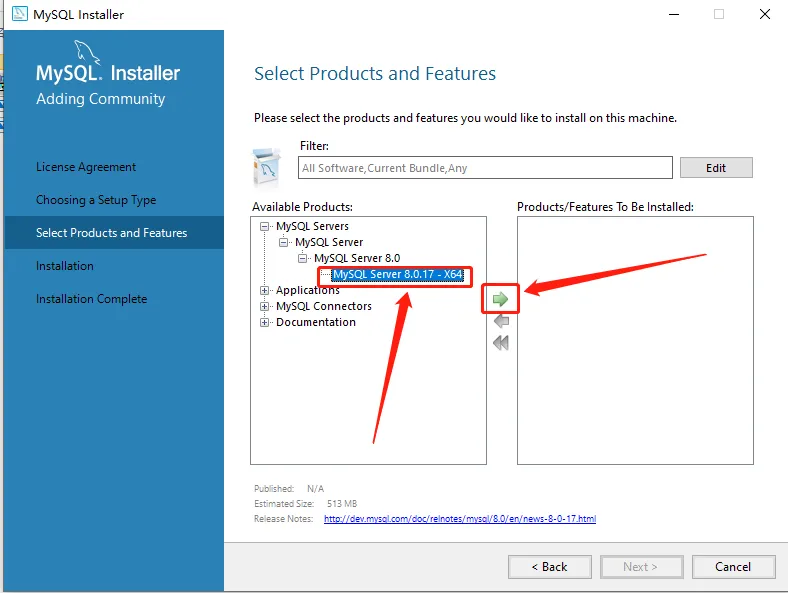 9.选中【MySQL Server 8.0.17-X64】,然后点击箭头按钮。