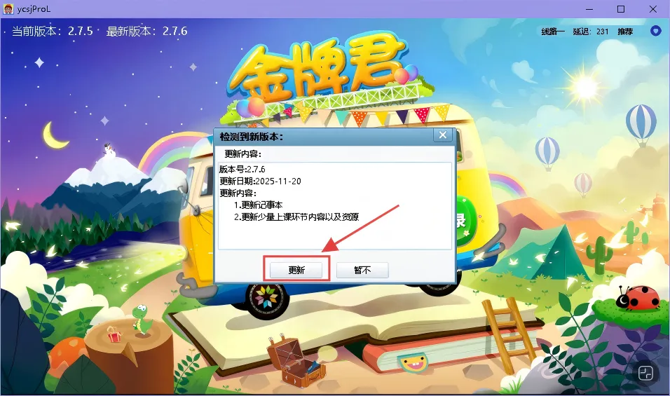 课件启动过程中偶会弹出如图所示的更新提醒界面,此时只需点击“更新”,待课件更新完成,就可以登录使用了。