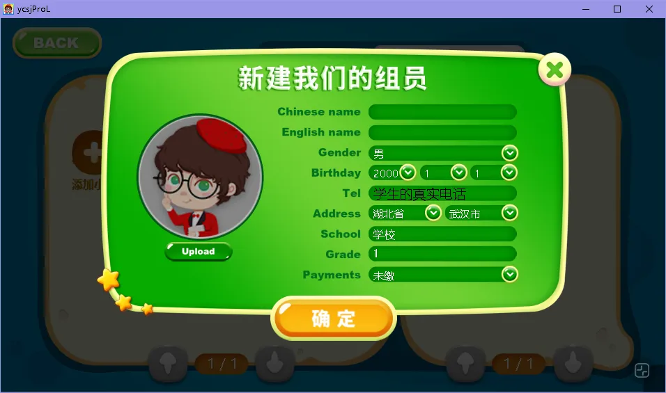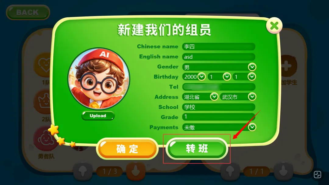 其中,“Tel”需填写学生登录金牌君小程序的手机号;“School”一栏建议填写学生当前正在就读的学校(非机构学校名称);学生头像支持本地上传,点击“Upload”按钮可上传头像照片(文件类型仅支持png及jpg格式),上传后可通过滑动滚轮调整图片大小,在红框内双击即可确定头像。