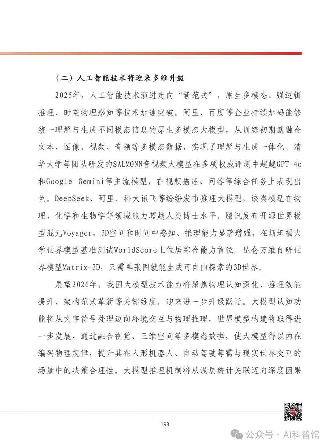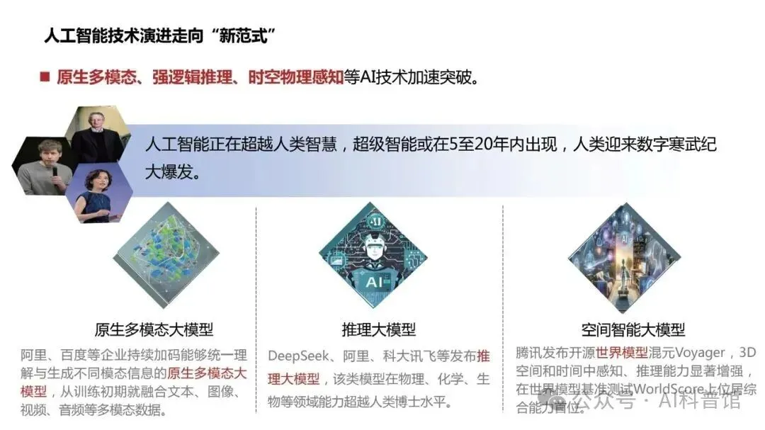 2025年,人工智能技术迈入全新发展范式,原生多模态、强逻辑推理、时空物理感知等关键技术加速突破。阿里、百度等企业聚焦原生多模态大模型研发,从训练初期即融合文本、图像、视频、音频等多维度数据,实现理解与生成能力一体化。清华大学研发的SALMONN音视频大模型在多项权威评测中超越GPT-4o、Google Gemini等主流模型,在视频描述、智能问答等综合任务中表现优异。DeepSeek、阿里、科大讯飞等企业纷纷推出推理大模型,其在物理、化学、生物学等领域的能力已超越人类博士水平;腾讯开源世界模型混元Voyager,在3D空间感知与时空推理能力上表现突出,登顶斯坦福大学WorldScore世界模型基准测试;昆仑万维自研Matrix-3D世界模型,可通过单张图片生成可自由探索的3D场景。