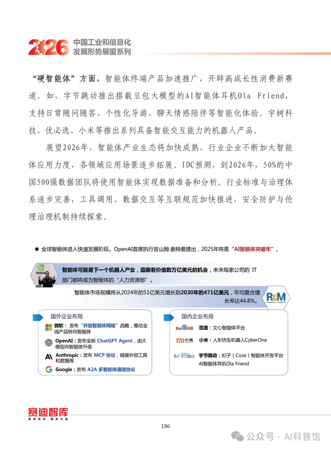2026年,智能体产业生态将加速走向成熟,企业应用力度持续加大,场景覆盖范围不断拓展。IDC预测,2026年我国50%的500强企业数据团队将运用智能体完成数据准备与分析工作。同时,行业标准与治理体系逐步完善,工具调用、数据交互等互联规范加快推进,安全防护与伦理治理机制持续优化,为智能体产业健康发展提供保障。