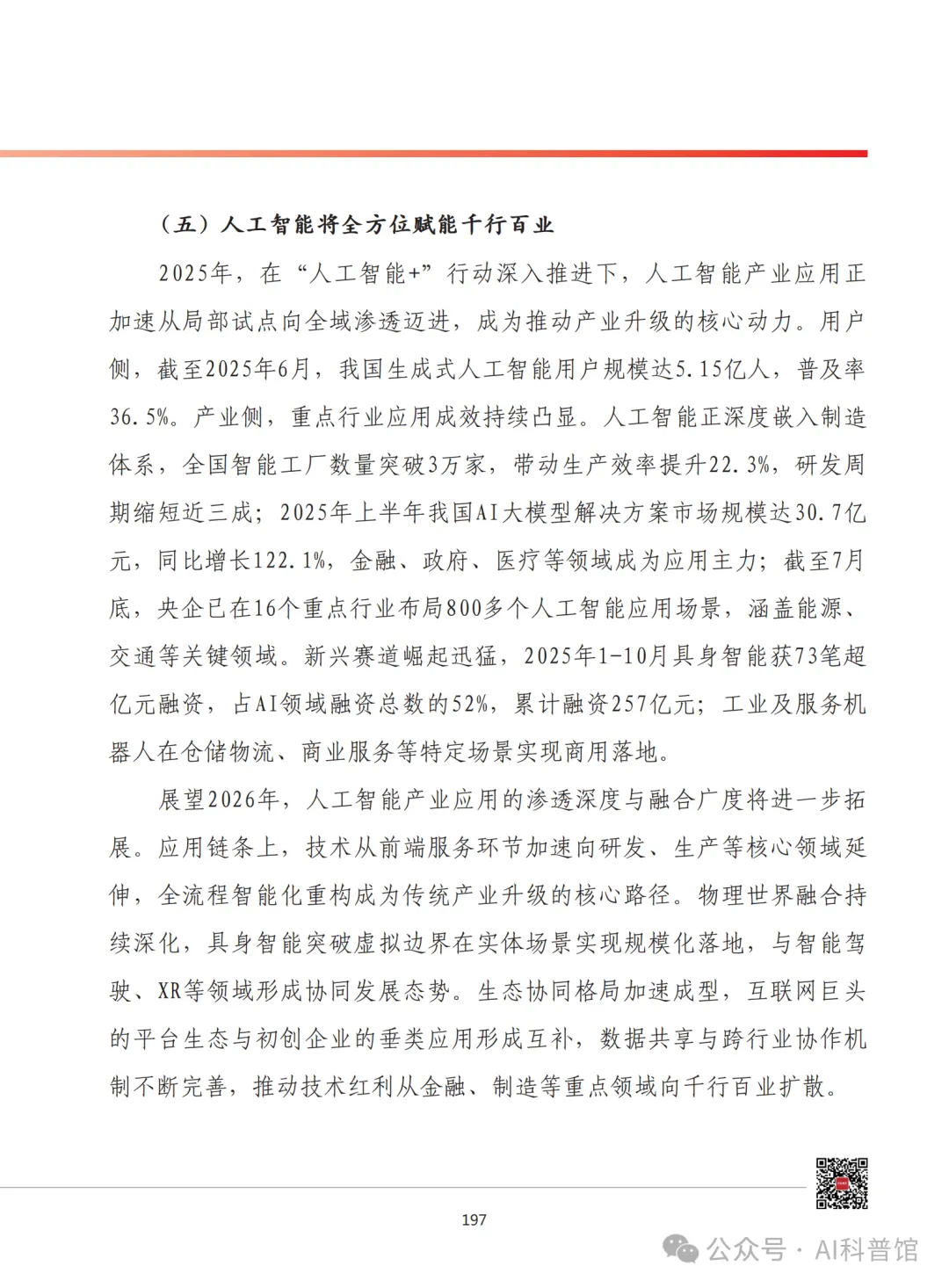 2025年,在“人工智能+”行动推动下,AI应用从局部试点向全域渗透,成为产业升级的核心动力。用户端,截至2025年6月,我国生成式AI用户规模达5.15亿人,普及率36.5%。产业端,重点行业应用成效显著:全国智能工厂数量突破3万家,带动生产效率提升22.3%,研发周期缩短近三成;2025年上半年AI大模型解决方案市场规模达30.7亿元,同比增长122.1%,金融、政府、医疗为核心应用领域;央企在16个重点行业布局800余个人工智能应用场景,覆盖能源、交通等关键领域。新兴赛道表现亮眼,2025年1-10月具身智能领域超亿元融资达73笔,占AI领域融资总数的52%,累计融资257亿元,工业及服务机器人在仓储物流、商业服务等场景实现商用落地。