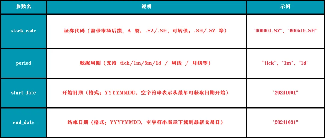 # coding:gbkimport numpy as npdefinit(C):# 1. 自定义配置参数(根据需求修改!)code_list = ["000001.SZ", "600519.SH", "110052.SH", "300750.SZ"]# 股票、可转债、ETF等品种列表period = "1m"# 数据周期:tick=分笔、1m=1分钟、5m=5分钟、1d=日线start_date = "20241001"# 开始日期(空字符串""表示从最早数据开始)end_date = ""# 结束日期(空字符串""表示下载到最新交易日)# 2. 调用批量下载函数my_download(code_list, period, start_date, end_date)defmy_download(stock_list, period, start_date="", end_date=""):'''批量下载函数:自动遍历品种,显示下载进度'''# 第一步:确定基础数据周期(QMT数据合成规则,避免下载失败)if"d"in period:# 日线及以上周期(如1d、1w、1m)base_period = "1d"elif"m"in period:# 分钟周期ifint(period.split("m")[0]) < 5:# 1-4分钟周期,基于1分钟数据合成base_period = "1m"else:# 5分钟及以上分钟周期(如5m、15m),基于5分钟数据合成base_period = "5m"elif period == "tick":# 分笔数据base_period = "tick"else:print("❌ 周期输入错误!支持:tick/1m/5m/1d/1w/1m")return# 第二步:遍历品种列表,逐一下载total = len(stock_list)for i, stock_code inenumerate(stock_list, 1):print(f"📥 正在下载 {i}/{total}:{stock_code}(周期:{period})")# 调用QMT内置下载函数download_history_data(stock_code, base_period, start_date, end_date)print("\n🎉 所有品种下载完成!")