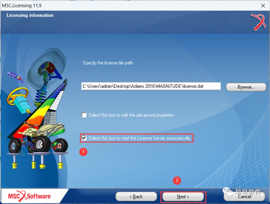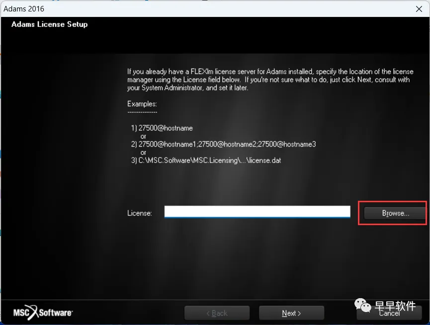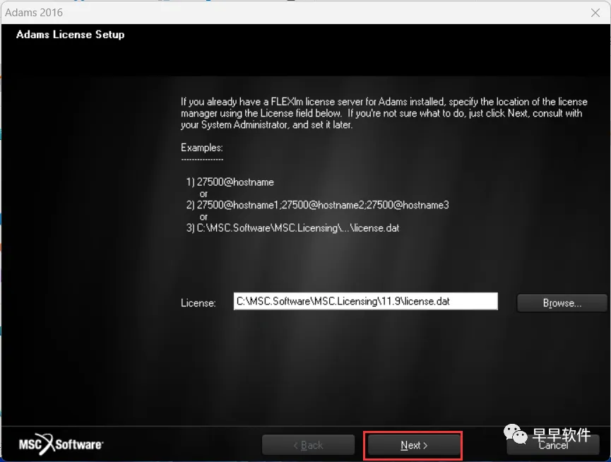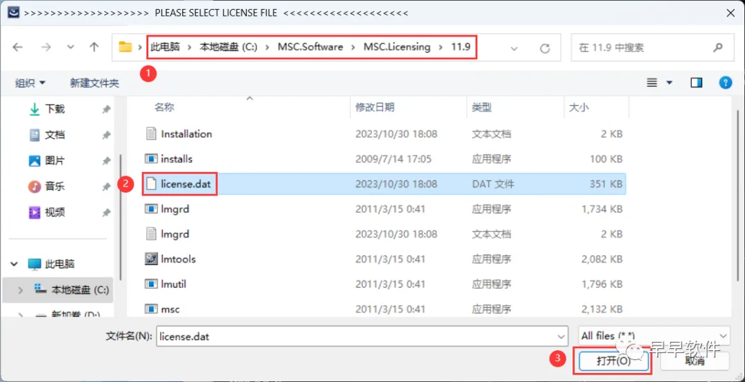 26、选择路径为:C:\MSC.Software\MSC.Licensing\11.9,找到并选中【license.dat】文件,再点击【打开】
