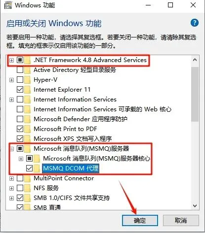 如果没有安装按以下步骤操作,点选“.NET Framework 3.5”和“Microsoft消息队列(MSMQ)服务”,点击“确定”,等待更改完成,点击“关闭”(若出现其他提示点击“让Windows更新为你下载文件”,等待下载安装完成即可)