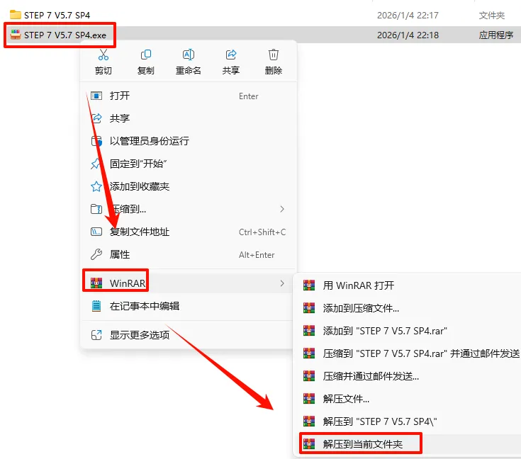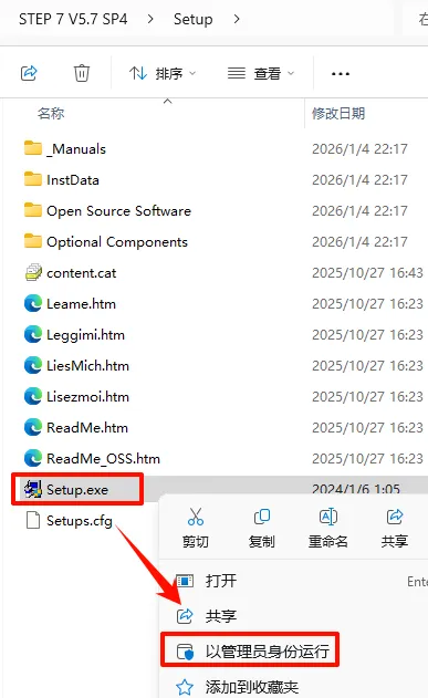 21.返回之前解压的“STEP 7 V5.7 SP4“文件夹,鼠标右键点击“Sim_EKB_Install_2025_12_04_Run_as_Admin.exe”选择“以管理员身份运行”