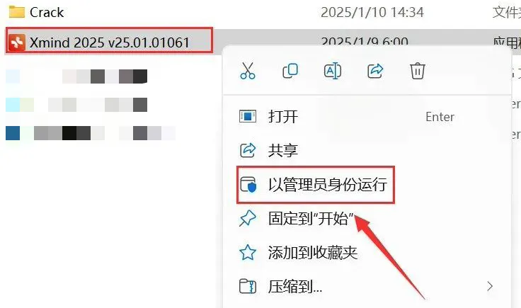 解压缩下载完的档案,紧接着点击刚解包的文件夹,搜寻[Xmind 2025 v25.01.01061]项,通过右键并作为管理者形式启动机件。
