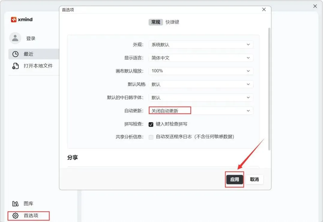 2.1,点击[首选项],接着向下移动至[关闭自动更新],按[应用]键。