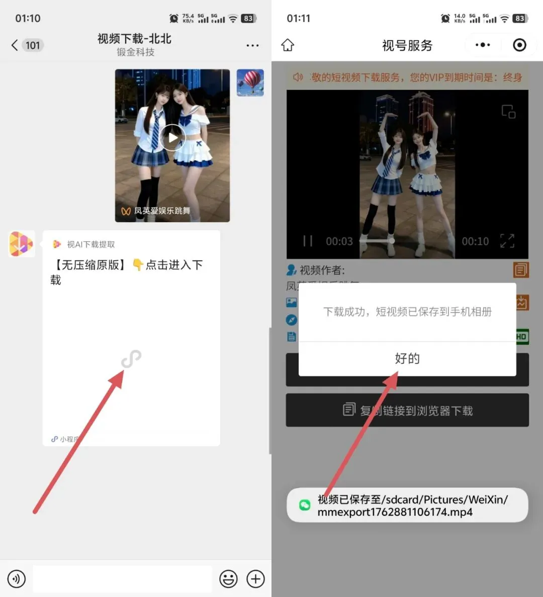 ②➡️ ✨ 噔噔噔!✨ 机器人会自动解析视频,并返回一个下载小程序。 进入小程序,一键点击,就能把视频保存到手机相册啦!是不是超级方便? 🥳