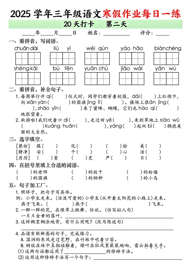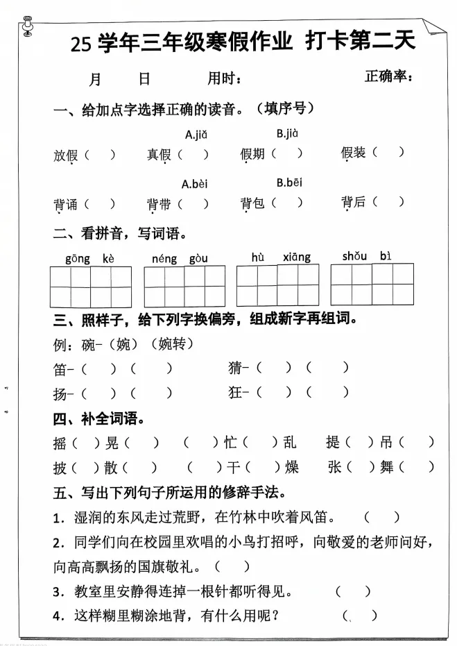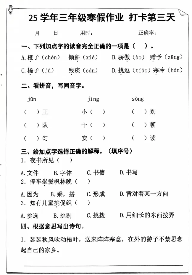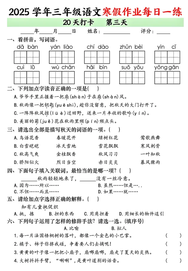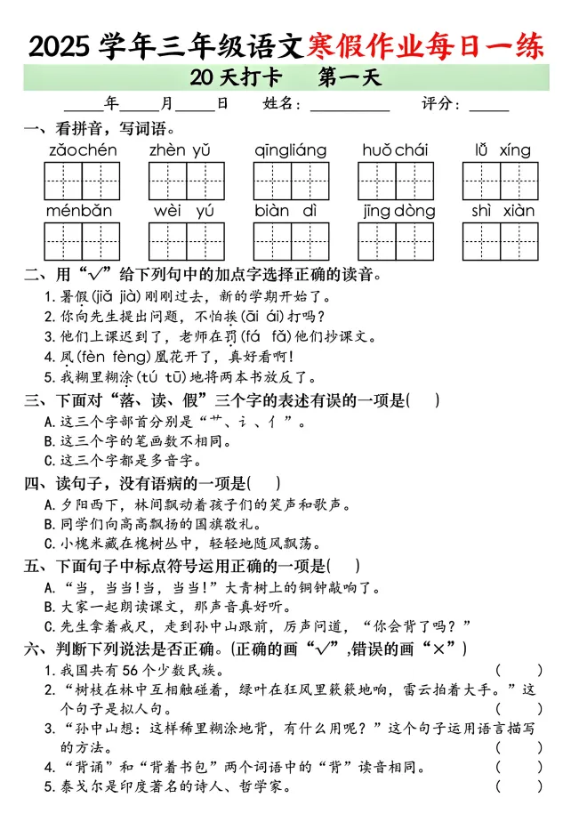 今天,给大家分享:26年三上语文寒假作业每日打卡!电子版!可下载打印!如果觉得这份资料不错,建议分享到班级群/年级群,让其他家长打印出来,帮助孩子学习