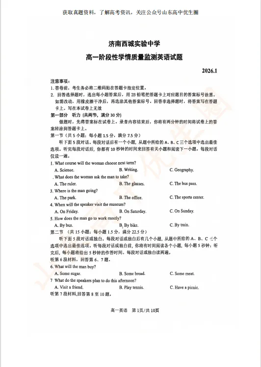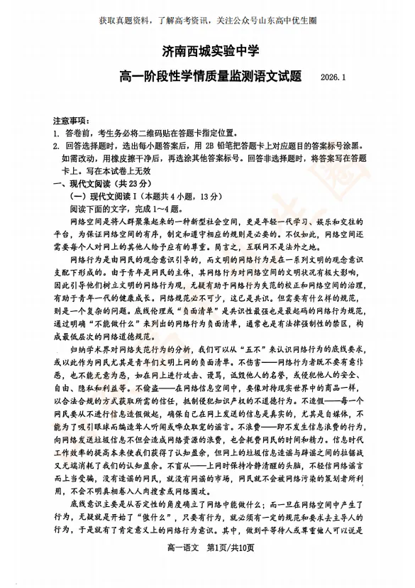 >【免费下载】25-26学年西城实验高一1月语文、英语真题,附解析