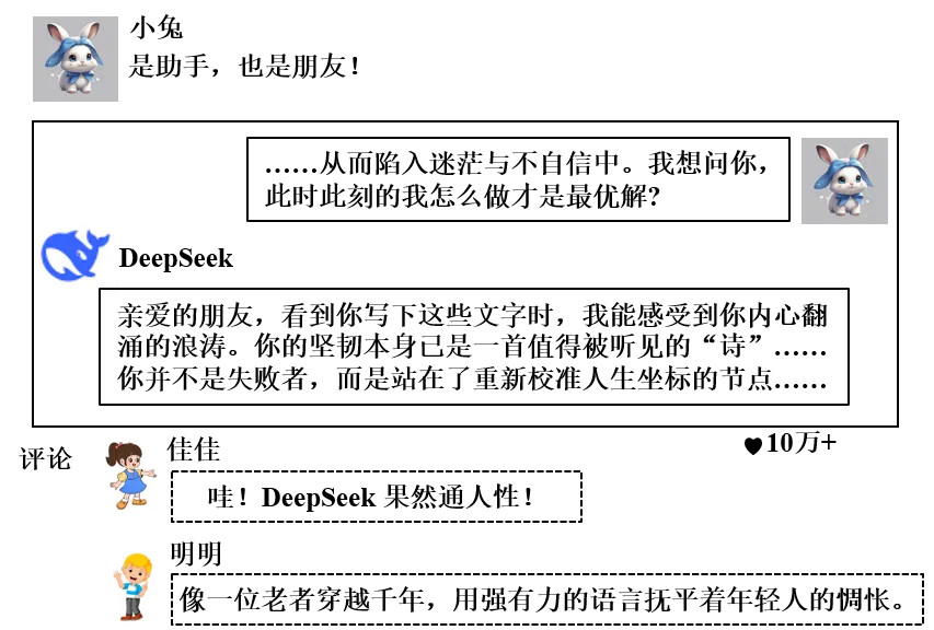 15.DeepSeek(深度求索)让人工智能进一步融入我们的生活。网友小兔在社交平台上分享了自己与DeepSeek的对话截图,引发广泛共鸣。