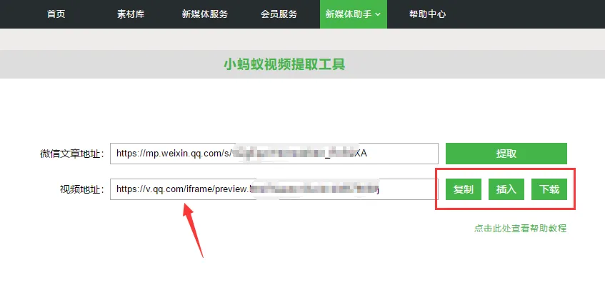 3、将地址粘贴在“微信文章地址栏”,并按“提取”