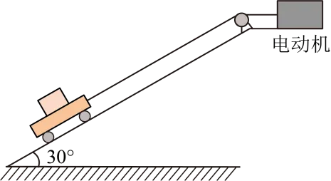 的光滑斜面固定在水平地面上,安装在其顶端的电动机通过不可伸长轻绳与小车相连,小车上静置一物块。小车与物块质量均为m,两者之间动摩擦因数为
