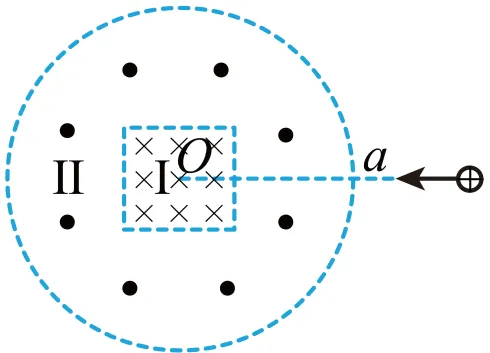 10.如图所示,I区有垂直于纸面向里的匀强磁场,其边界为正方形;Ⅱ区有垂直于纸面向外的匀强磁场,其外边界为圆形,内边界与I区边界重合;正方形与圆形中心同为O点。I区和Ⅱ区的磁感应强度大小比值为4∶1。一带正电的粒子从Ⅱ区外边界上a点沿正方形某一条边的中垂线方向进入磁场,一段时间后从a点离开。取sin37°=0.6。则带电粒子( )