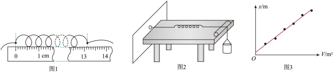 (4)以小桶中水的体积V为横坐标,弹簧伸长量x为纵坐标,根据实验数据拟合成如图3所示直线,其斜率为200m−2。由此可得该弹簧的劲度系数为N/m(结果保留2位有效数字)。