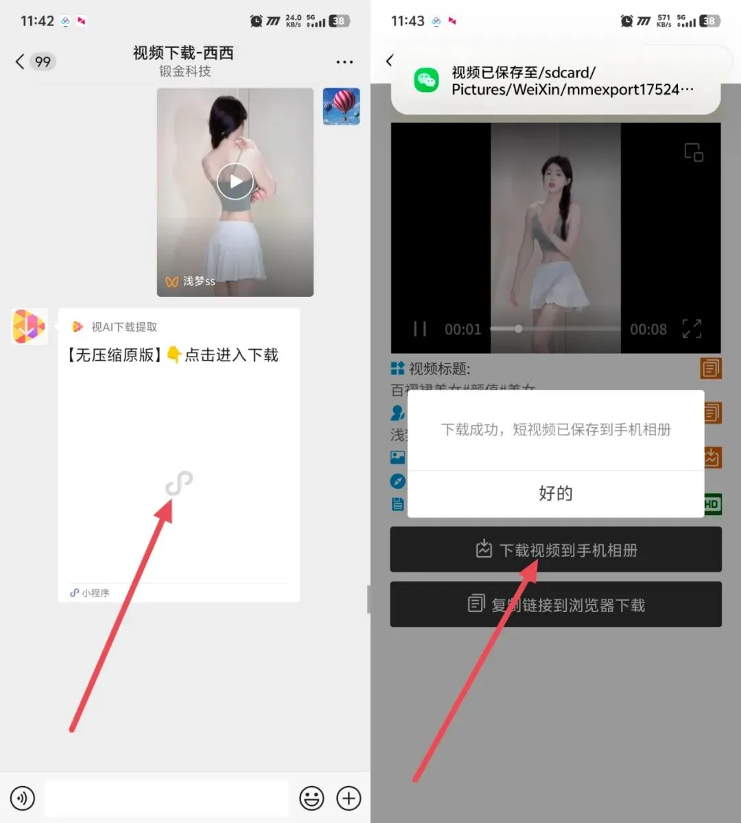 2️⃣ → 机器人会自动解析链接,马上返回下载小程序,点进小程序就能一键保存到手机相册!