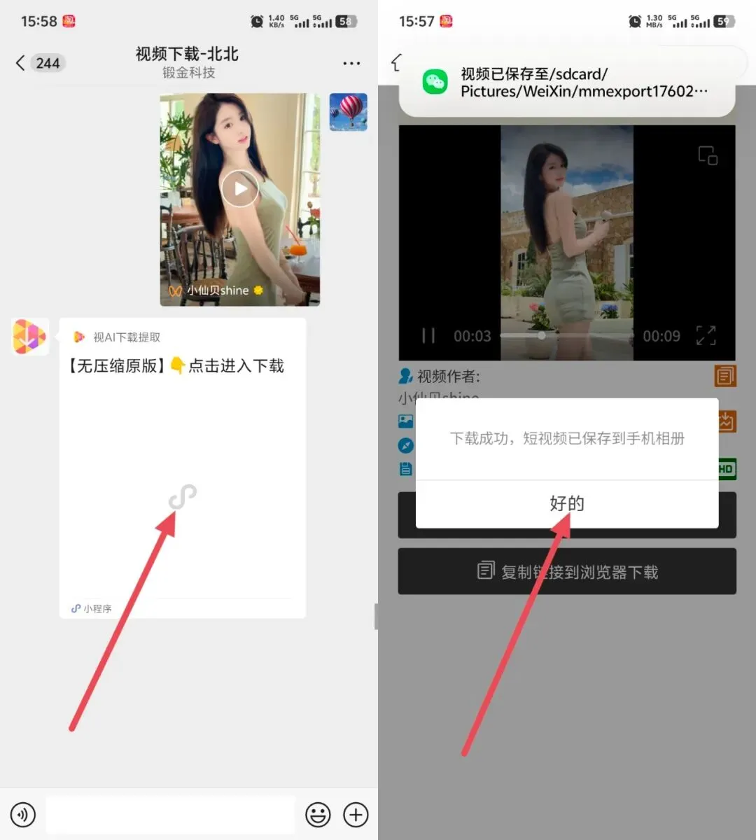 ② “视频下载机器人”会自动解析视频,并返回一个下载小程序链接 👉 点击进入小程序 👉 一键下载到手机相册!就这么简单!