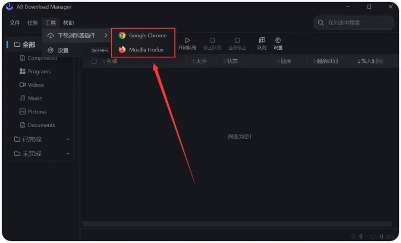 浏览器一键捕获:提供了Chrome 和 Firefox 浏览器插件。安装后,网页上的视频、软件等资源链接可以直接捕捉并发送到ABDM中下载,无需手动复制粘贴,无比便捷。