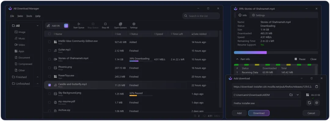 AB Download Manager 是一款功能全面的免费开源下载器,支持Windows 和 Linux双平台。它的核心绝技是智能多线程技术,能够将网络带宽利用率发挥到极致,官方宣称下载速度最高可提升500%,体验过就知道什么叫“飞一般的感觉”。