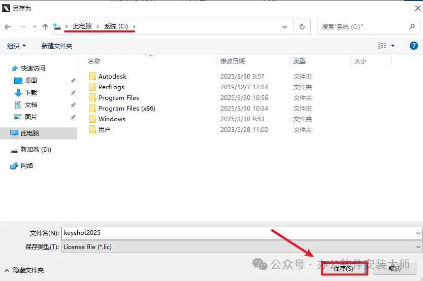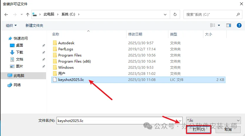 21.选择【C盘】,找到刚才生成的【keyshot2025.lic】选中并点击【打开】