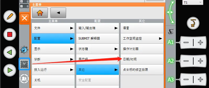 现场KUKA版本在KSS8.6以后,你会发现在配置--其它的子菜单中多了一个项目就是日期与时间,接下我们点击进去看看~