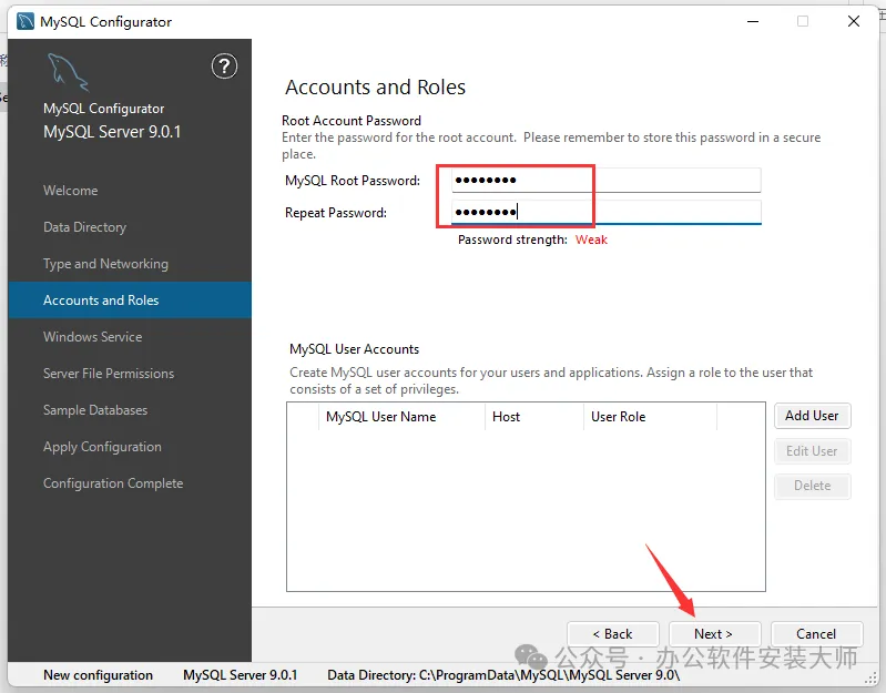 13.设置密码一个(注意!两次输入必须一致,记住密码后面还有用。),输入好点击【Next】。
