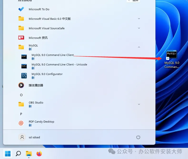 ②将【MySQL 9.0 Command Line Client】这个图标拖动到电脑桌面即可创建