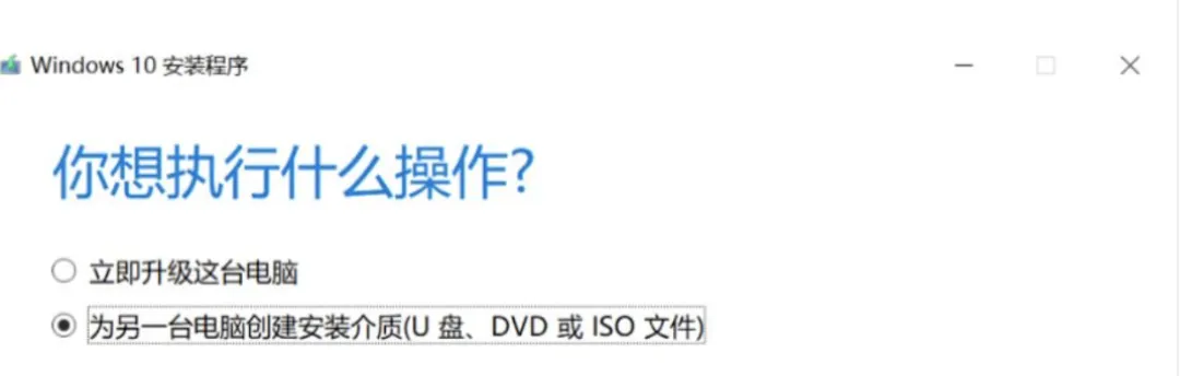 选择:为另一台电脑创建安装介质(U 盘、DVD 或 ISO 文件)