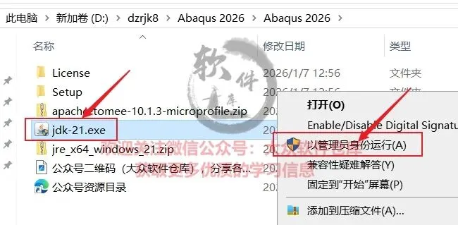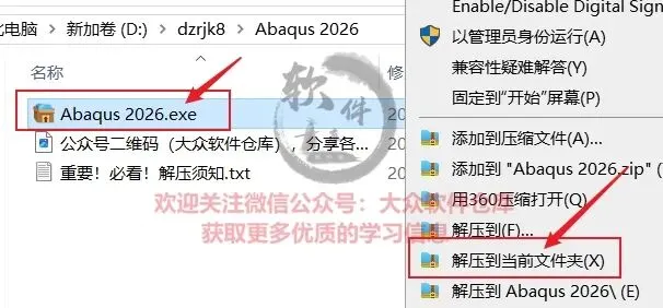 1.把资源从网盘下载到电脑上面,右键Abaqus2026.exe压缩包选择解压到当前文件夹;