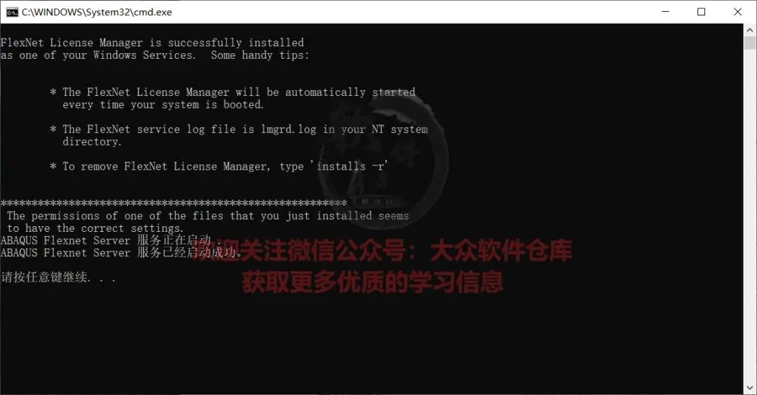 10.显示服务成功启动后,点击任意键关闭界面;(如果无法启动请关闭防火墙和杀毒软件重试)