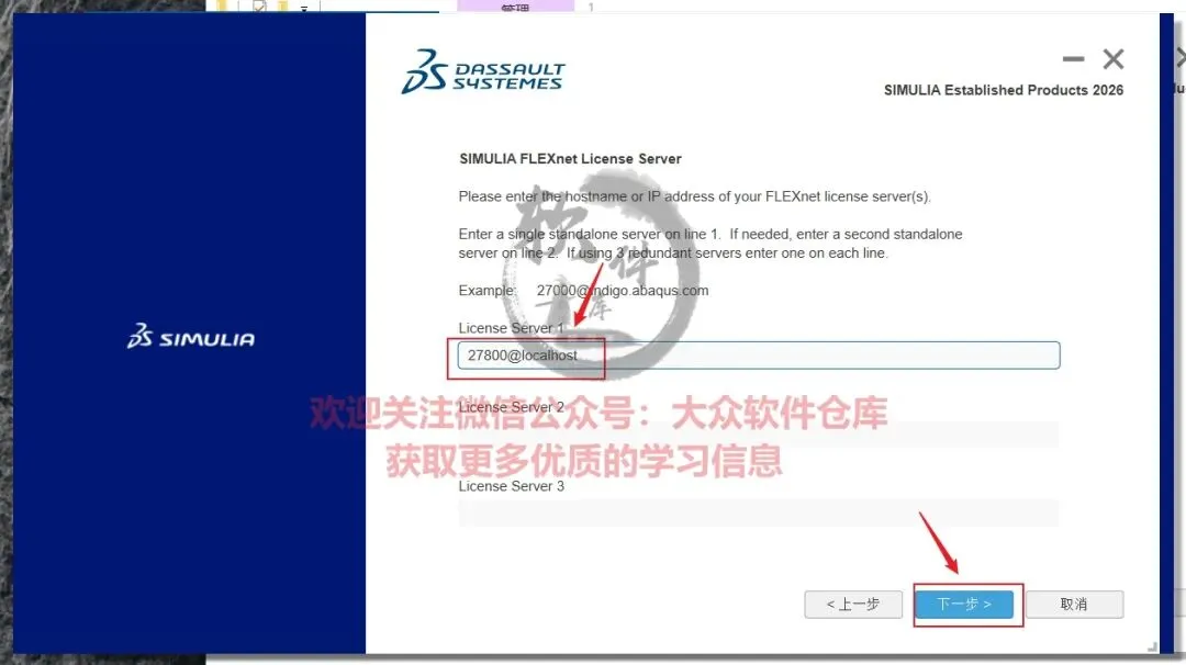 36.在License Server1中填写27800@localhost,然后点击下一步;