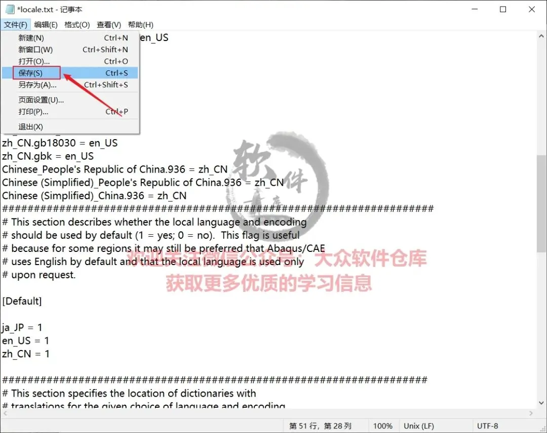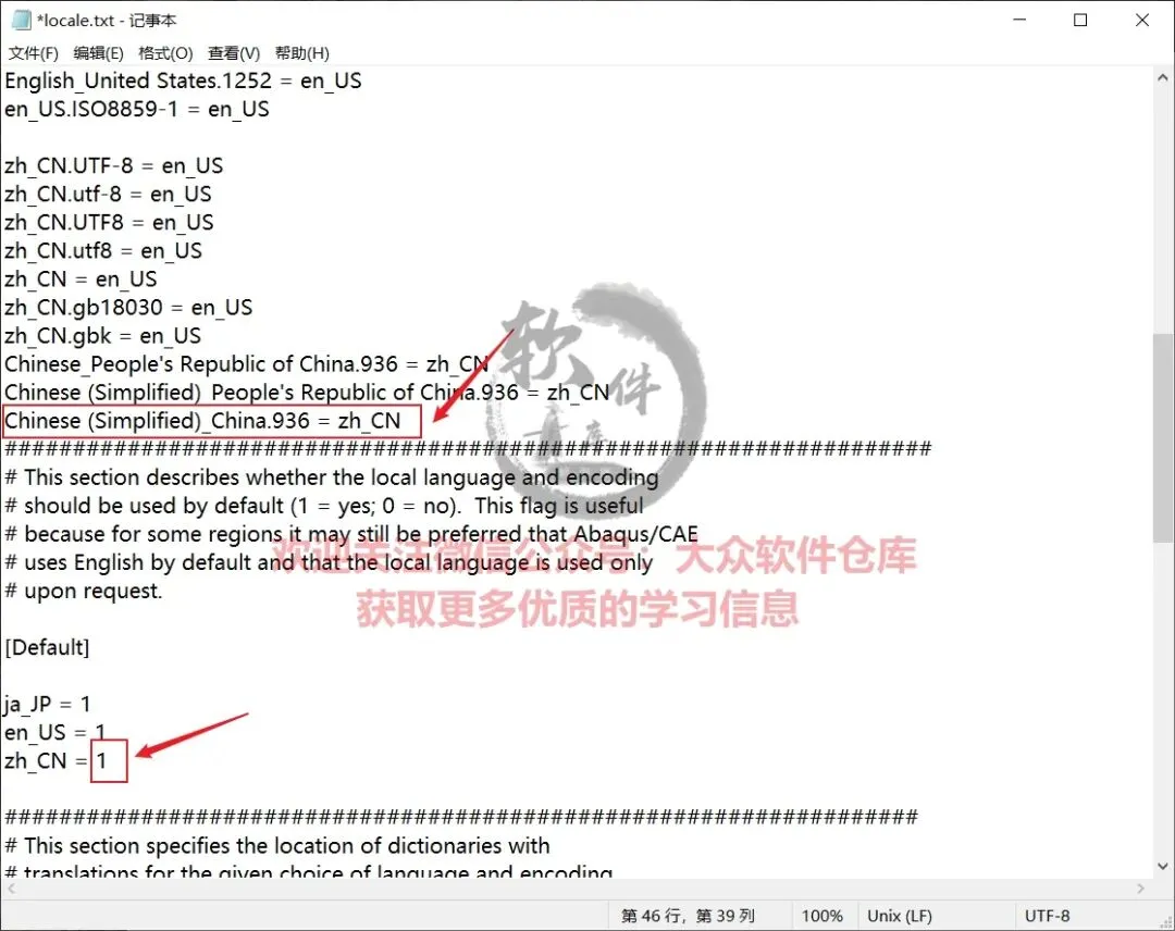 72.在第二行“########……”前加上【Chinese (Simplified)_China.936 = zh_CN】,在第三行“########……”前,将【zh_CN = 0】改为【zh_CN = 1】。