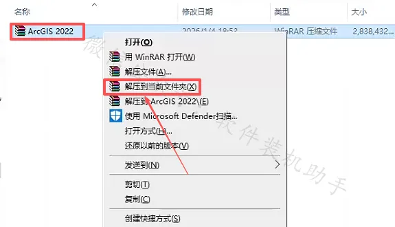 1.打开下载的ArcGIS软件安装包,鼠标右击压缩包选择【解压到当前文件夹】。