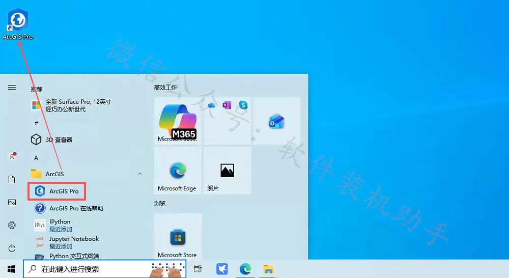 21.软件安装完后没有桌面启动图标,在开始菜单里找到【ArcGIS Pro】,鼠标拖拽到桌面上即可生成桌面启动图标。