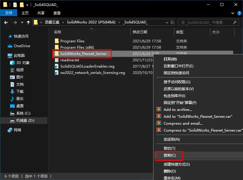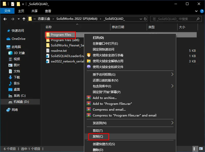 27.鼠标右击【Program Files】文件夹选择【复制】28.打开软件的【安装位置】(如在步骤17中将C更改为了D,则打开D盘),在空白处鼠标右击选择【粘贴】29.打开压缩包解压后的【SolidWorks2022(64bit)】文件夹,双击打开【_SolidSQUAD_】文件夹
