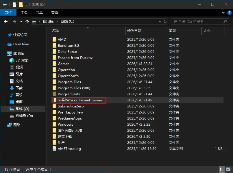 6.鼠标右击该文件夹下的【SolidWorks_Flexnet_Server】文件选择【复制】7.打开电脑【C盘】,在空白处鼠标右击选择【粘贴】8.双击打开粘贴后的【SolidWorks_Flexnet_Server】文件夹