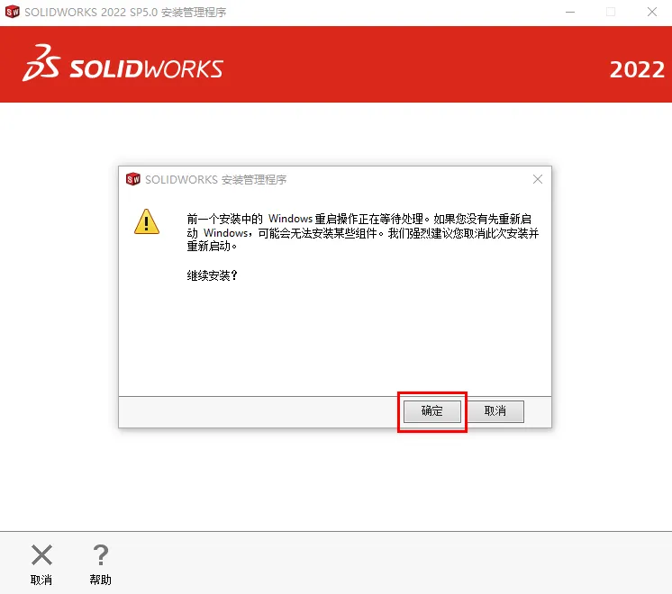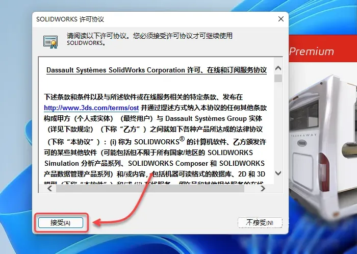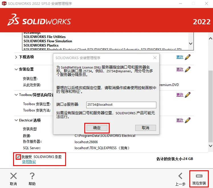 22.勾选【我接受SOLIDWORKS条款】,点击【现在安装】,点击【确定】