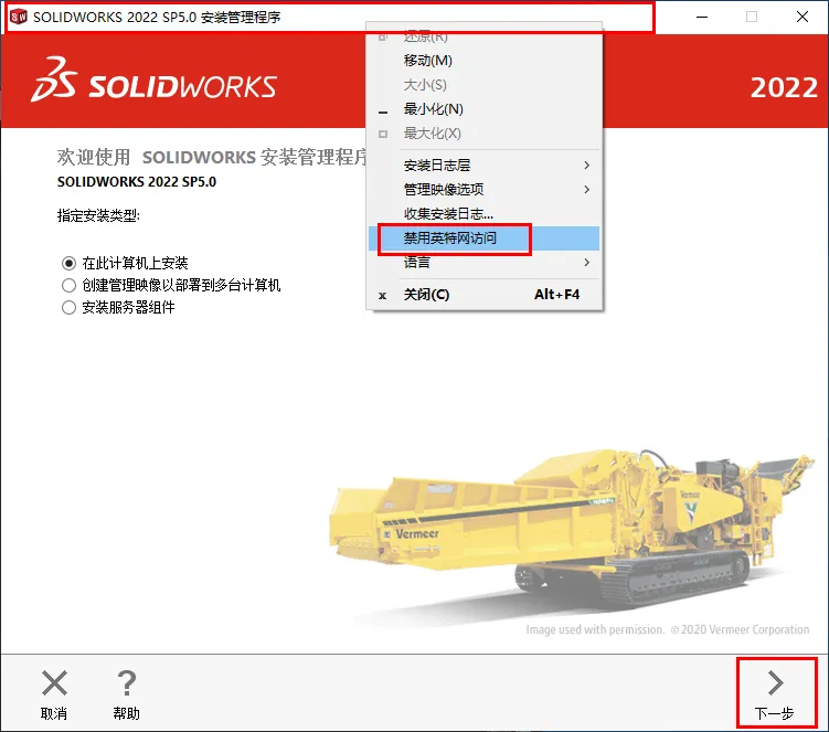 12.打开解压后的文件夹,鼠标右击【setup】选择【以管理员身份运行】14.鼠标右键【标题栏】选择【禁用英特网访问】点击【下一步】15.勾选需要安装的产品(SW产品众多,尽量只选择自己需要的产品),点击【下一步】16.点击【安装位置】后的【更改】