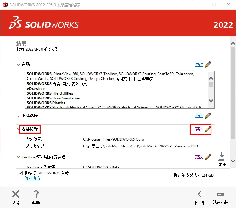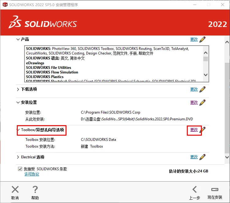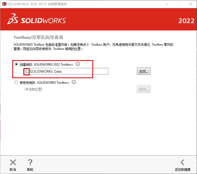 17.修改路径地址中的C可更改安装位置(如:将C改为D表示安装到D盘),点击【返回摘要】18.点击【Toolbox异型孔向导选项】后的【更改】