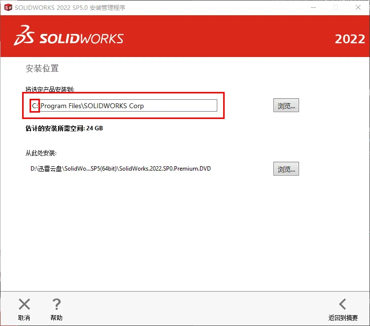 21.修改路径地址中的C可更改安装位置(如:将C改为D表示安装到D盘),点击【返回摘要】