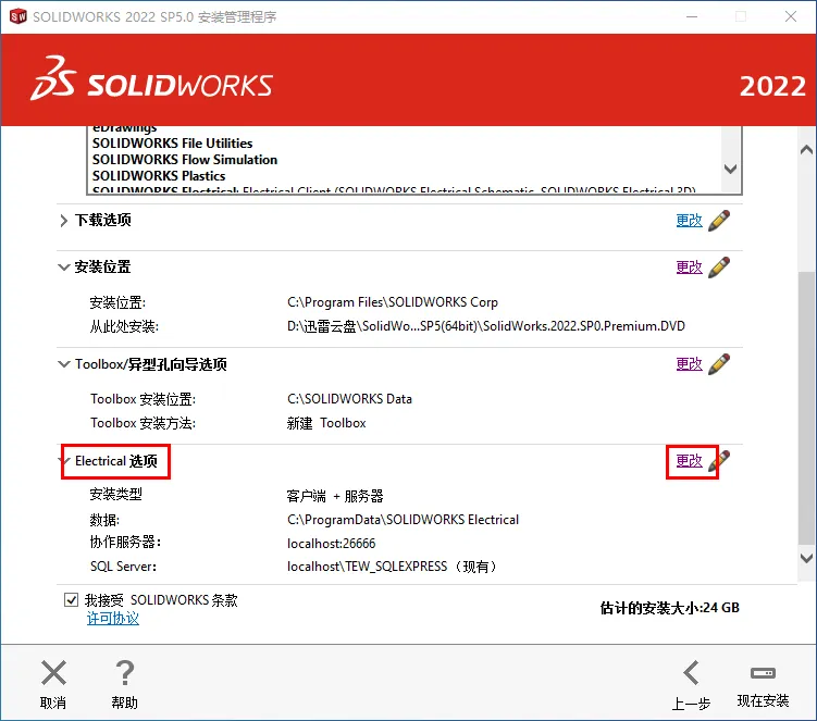 19.修改路径地址中的C可更改安装位置(如:将C改为D表示安装到D盘),点击【返回摘要】20.点击【Electrical选项】后的【更改】