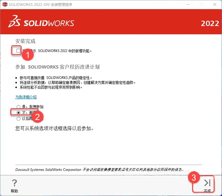 24.取消勾选【为我显示SOLIDWORKS2022中的新增功能】,选择【不,谢谢】,点击【完成】