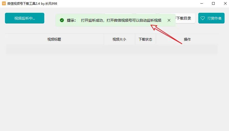 打开后,在软件的上方会有显示“打开监听成功,打开微信视频号可以自动监听视频”。