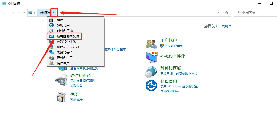 2.点击【▼】,然后点击【所有控制面板选项】。